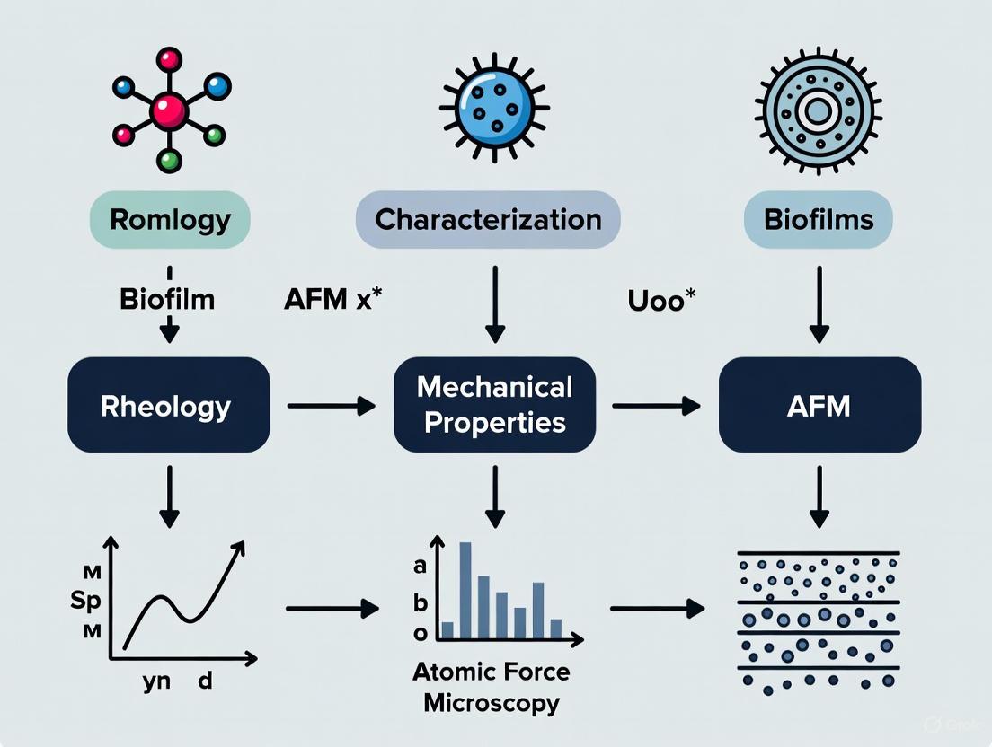 This article provides a comprehensive overview of the combined application of rheology and Atomic Force Microscopy (AFM) for the advanced characterization of microbial biofilms. Aimed at researchers, scientists, and drug development professionals, it explores the foundational principles of biofilm viscoelasticity and nanomechanics. The content details methodological protocols for integrated mechanical-structural analysis, addresses common troubleshooting and optimization challenges, and validates the approach through comparative analysis with other techniques. By synthesizing insights from current literature, this review underscores the transformative potential of this combined methodology for developing effective anti-biofilm strategies and therapeutics, ultimately aiming to bridge the gap between fundamental research and clinical application in managing biofilm-associated infections.